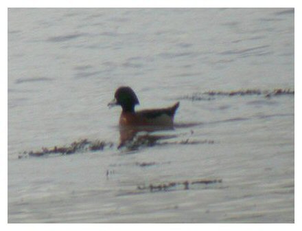 [No sign of the escaped duck today, but I saw it at dusk last night. Strange, but nice, looking thing. It is most like a male Brown Teal: Wigeon-sized, green head, steel-grey bill (with thin black line down it), dark reddish eye, red-brown chest, grey-brown flanks, dark brown back, black tail with russet red undertail and vent, with a light patch (off-white) between vent and belly. It also had a manned crest, shaped just like a Wood Duck (but all green), which only showed when it extended its neck to call (thin double-noted whistle) and, I think, display. It had a white belly (like Wigeon), and a long tail; between female and male Pintail in length. I also saw it fly a short distance - it didn't have any white wing-bars, but may have had an indistinct buff wing-bar.]
