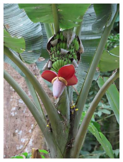 A Banana plant in the forest with fruit and