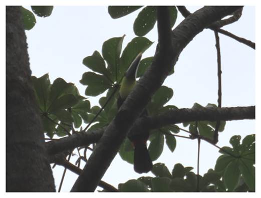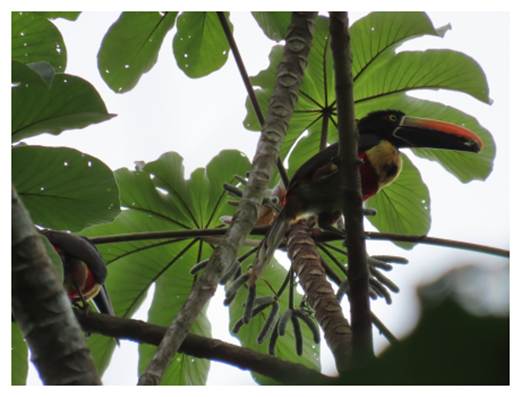 the canopy, with a couple of Fiery-billed Aracari.