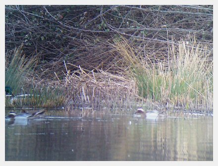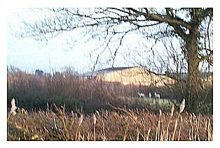 A poor photo of a group of 4 white Fallow Deer seen near Oldbury Naite, Saturday 14/2/04. (They're the white dots through the gap in the hedge !)